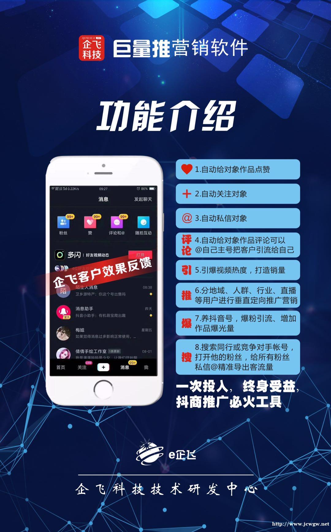 企飞科技——“巨量推”营销软件,这款软件是安装到安卓手机上面的,适用于抖音和快手平台。一部手机安装一个软件登录一个账号,独立ip保护,安全稳定效率快……